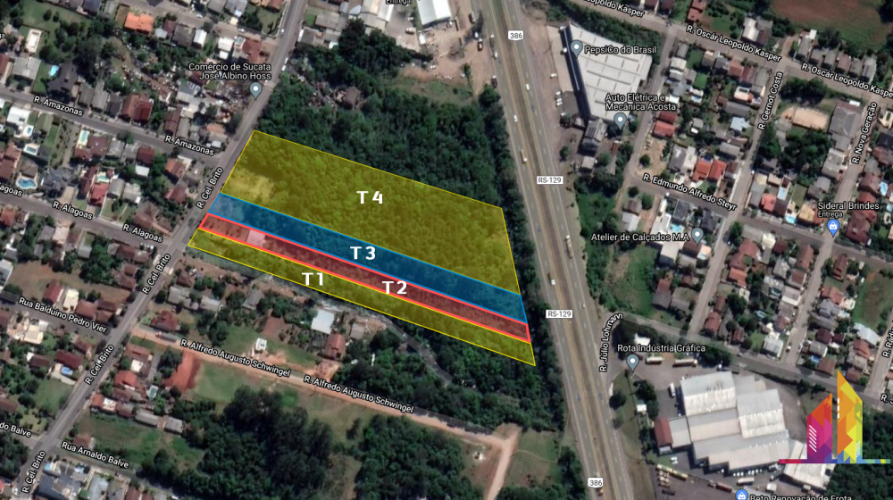 T1 – Terreno com 5.207m² – 18,76m de frente para Rua Cel. Brito – 23,20m de fundos para BR386 – Laterais 280m.